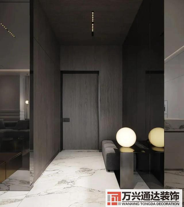 ▲玄關的墻面以灰木色的木飾面包圍,布置一張布藝長板凳作為換鞋凳+小茶幾,小茶幾上布置球形小臺燈,讓空間顯得格外的創(chuàng)意端莊而舒適。
