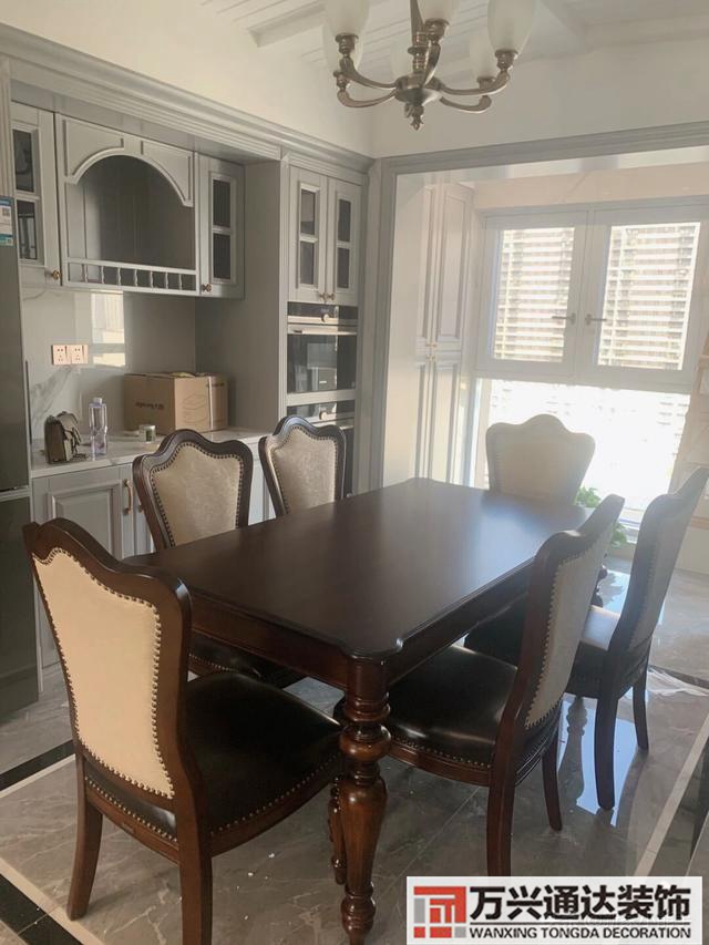 144平四房兩廳南北通透的戶型,其實對于這樣相對面積有點大的房子,選擇裝修美式風格也比較合適哈。現在所看到的是餐廳區域,布置了一張美式實木方形餐桌,占用的空間大小位置合適。旁邊定制了一個非常實用的大酒柜,可以提供大量的儲物空間。定制的餐邊柜,在造型上比較常見,而且偏灰色,非常耐臟。家里餐廳區域空間足夠大的,其實選擇設計餐邊柜,很有必要。以后生活過程中,很多東西都可以方便收納起來。地面做了黑色與白色搭配的波導線條,增加了視覺沖擊感。